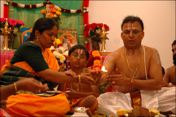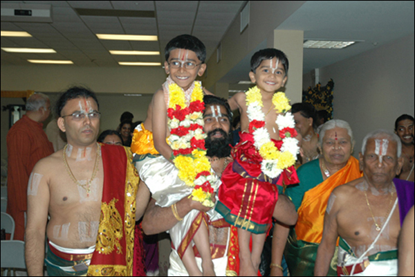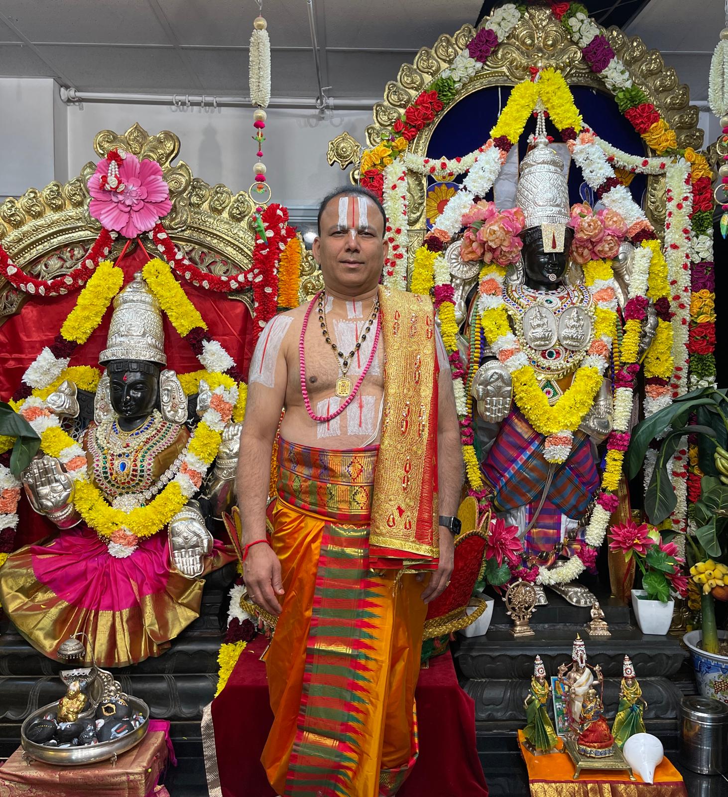 Krishnamachar Archakam, also revered as Priest Krishnamurthy, is the esteemed founder and head priest (Pradhana Acharya) of the Vedic Temple of Virginia. Arriving in the United States in 1998 from a orthodox religious family in India, he brings over 25 years of overseas experience in leading a wide array of Hindu rituals and services, deeply rooted in his mastery of Veda and Agama scriptures.